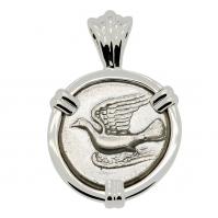 • Greek 330-280 BC, Dove and Chimaera triobol in 14k white gold pendant.