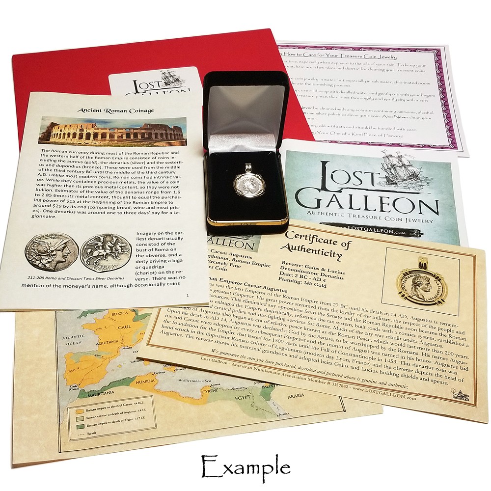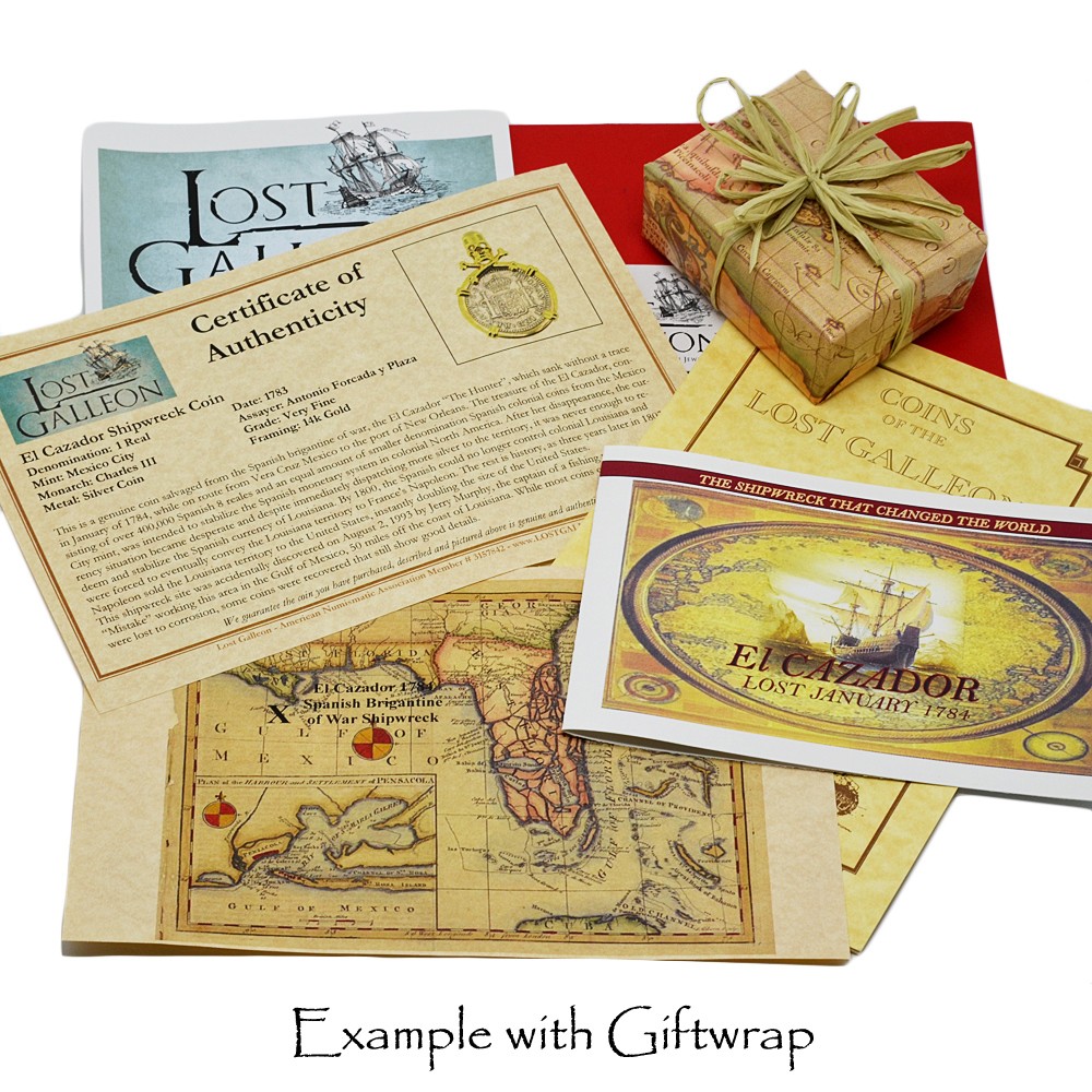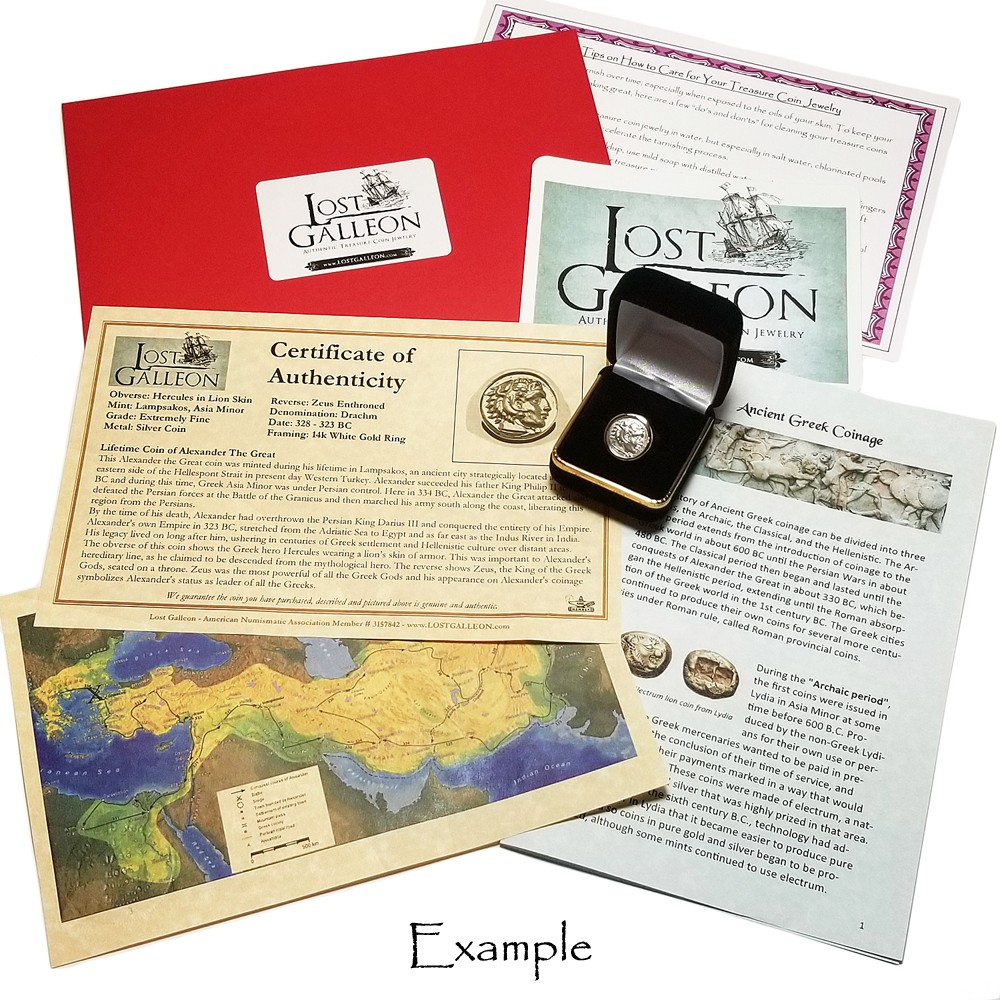 Coins of the Lost Galleons, a 28 page guide to Spanish colonial era coins is included with every Spanish treasure piece. Ancient Greek and Roman coins will come with a four page story about their particular ancient coinage. All other coins will come with a four page story on the History of Coin Minting.
